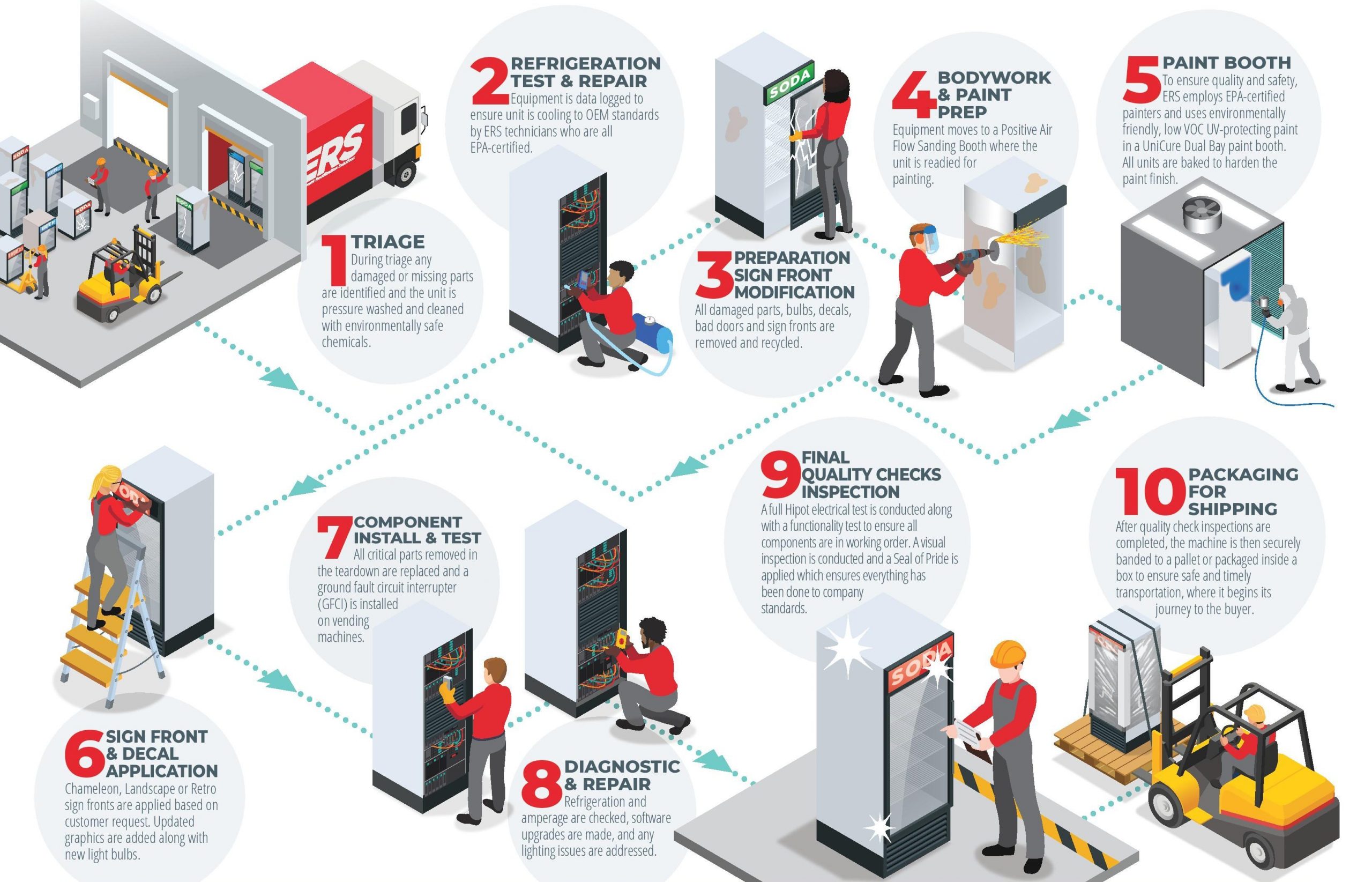 For total refurbishing of your coolers, venders and fountain units, ERS operates four remanufacturing centers: LaVergne, TN; Monroe, NC; Louisville, KY; and Annapolis, MD.